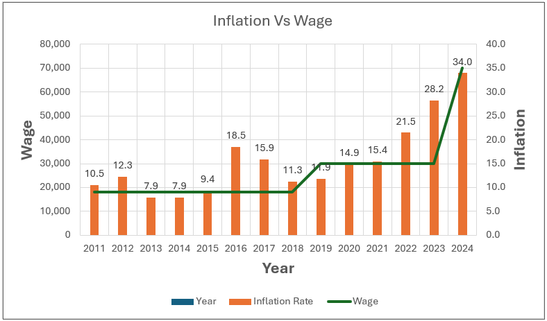 To keep things simple, if we calculate the 2024 minimum wage based on the Governor of Edo State, Obaseki’s calculation uses the exchange rate as the primary factor and justifies his recent increment to N70,000. The table shows a side-by-side comparison of inflation, the US dollar (USD) exchange rate to the Naira, and the minimum wage from 2011 to 2024. Despite the rapid rise of inflation and the humbling of the naira against the USD, the minimum wage remains unchanged from 2011 to 2018 at N18,000, from 2019 to 2023 at N30,000 and now at N70,000, as shown in the figure.