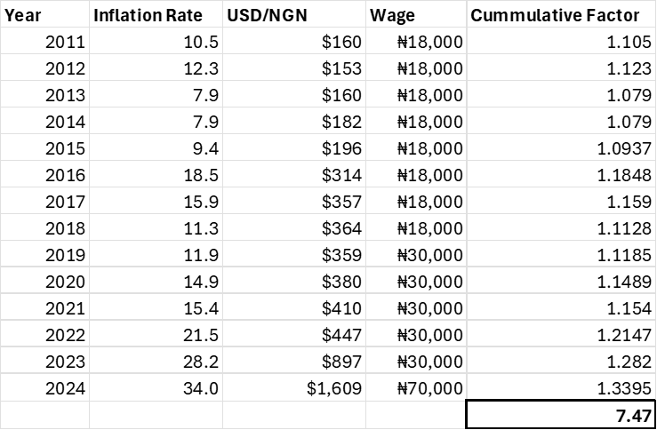 River. (2021). Cumulative Inflation | River Glossary. River; Cumulative Inflation | River. https://river.com/learn/terms/c/cumulative-inflation/#:~:text=Cumulative%20inflation%20is%20calculated%20byTaiwo, E. (2024). Nigeria’s minimum wage in numbers: From N125 in 1981 to over N490k demand in 2024. Vanguard. https://www.vanguardngr.com/2024/06/nigerias-minimum-wage-in-numbers-from-n125-in-1981-to-over-n490k-demand-in-2024/#:~:text=Over%20the%20years%2C%20the%20minimum,of%20N30%2C000%20per%20month.